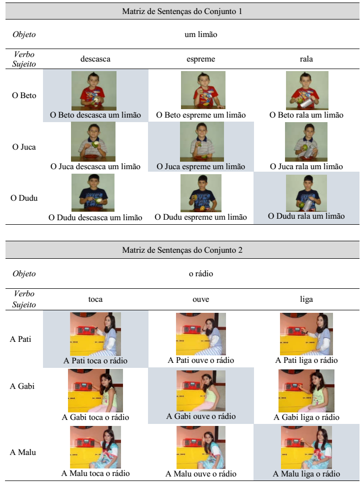 Os estímulos adotados foram planejados a partir de matrizes de três linhas e três colunas. A Figura 1 apresenta as matrizes de sentenças dos Conjuntos 1 e 2.