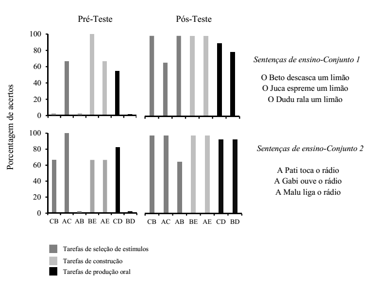No Pré-Teste de relações condicionais envolvendo a seleção de estímulos do Conjunto 1, a participante apresentou desempenho ora nulo (relações CB e AB) ora seleções aleatórias típicas de resultados de acaso (relação AC). Nas tarefas de composição condicionadas pela figura de ação, o desempenho foi preciso (BE) e nas condicionadas pela palavra ditada foi de 67% de acertos (AE). Nos testes de produção oral, a porcentagem de acertos foi superior em leitura (54,55% em CD) se comparada com nomeação (nulo em BD), sendo observada uma discrepância entre as porcentagens de acertos.