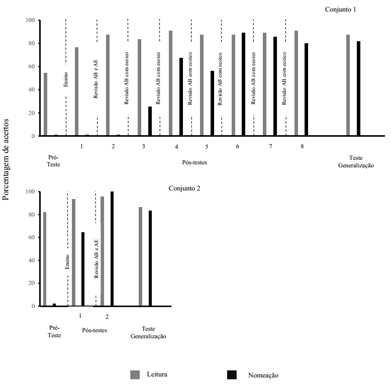 A participante apresentou desempenho nulo em nomeação no primeiro pós-testes do Conjunto 1 e esse desempenho foi mantido após a revisão do ensino das relações de seleção de figuras diante da sentença ditada (AB) e de construção de sentenças mediante sentença ditada (AE). Considerando esse resultado em nomeação de figuras, foi inserida uma revisão do ensino AB com treino ecoico e foi observado que no pós-teste seguinte (pós-teste 3) a participante demonstrou uma nomeação com 25,45% de correspondência ponto a ponto de acordo com a comunidade verbal. Nos cinco pós-testes subsequentes de nomeação, ainda com alguma variabilidade, a porcentagem de acertos aumentou