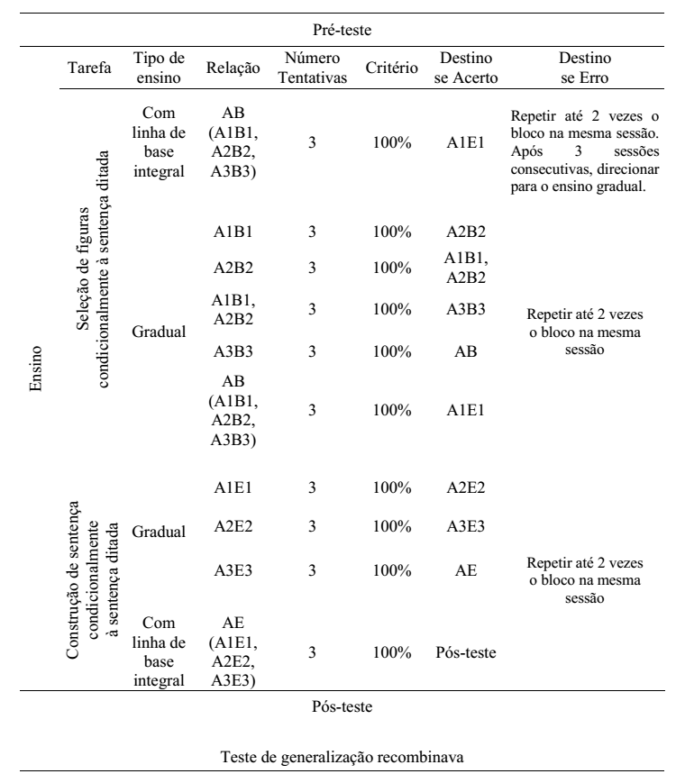 Para o ensino de seleção de figuras diante da sentença ditada (AB), caso a participante não alcançasse o critério em até três exposições ao bloco, a sessão seria encerrada e o ensino retomado na sessão seguinte. Na condição de recidiva de erros em até quatro sessões consecutivas, a participante seria redirecionada para o ensino gradual, no qual cada uma das relações condicionais entre sentenças ditadas e figuras de ações eram treinadas isoladamente (A1B1, A2B2 e A3B3), seguida de blocos de revisões da linha de base integral, nos quais todas as relações eram misturadas em um mesmo bloco. Na sequência do ensino AB, a aprendiz seria exposta a tarefas de composição de sentenças impressas por ditado (AE), na qual cada relação era treinada isoladamente (A1E1, A2E2 e A3E3), seguida de bloco de tentativas que integravam todas as relações.