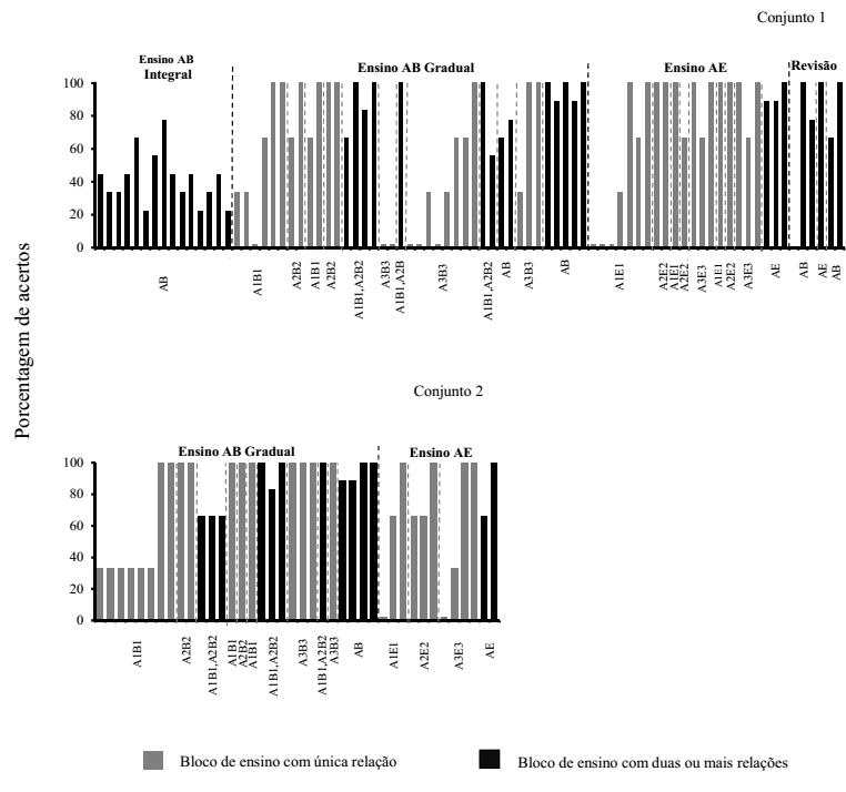 Durante o ensino da seleção de figuras de ação condicionalmente à sentença ditada (AB) do Conjunto 1 (vide parte superior da Figura 3), com as três relações condicionais (Ensino AB integral na Figura 3), pode-se notar que a participante manteve inconsistência no desempenho, com uma variação entre 33,33% ou 44,44% de acertos ao longo de 15 exposições consecutivas aos blocos de ensino. Considerando que o critério de acertos estabelecido não foi atingido, foi programado um ensino gradual em que cada relação AB (A1B1, A2B2 e A3B3) foi ensinada isoladamente, com acréscimo gradativo de cada uma das relações ao longo da exposição aos blocos. Quando exposta ao ensino gradual, a participante necessitou de cinco exposições à relação A1B1 até obter 100% de acertos e de duas exposições para atingir o critério na relação A2B2. Nos blocos que randomizaram as relações A1B1e A2B2, a participante atingiu 100% de acertos na segunda exposição. O ensino A3B3 demandou nove exposições para que a participante atingisse o critério. A participante foi exposta à revisão de ensino das três relações condicionais ensinadas e obteve inicialmente 55% de acertos, apresentando aumento do desempenho ao longo das quatro exposições e atingiu o critério (100% de acertos) na terceira e quarta exposições.