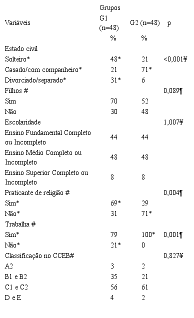 Ao comparar as características dos dois grupos, G1 e G2, os resultados dos dados sociodemográficos indicaram diferenças significativas em relação ao estado civil, a trabalhar e a ser praticante de religião. Dessa forma, estar solteiro ou divorciado, não trabalhar e praticar religião foram características associadas ao G1, grupo de usuários de crack. Enquanto estar casado ou ter companheira, trabalhar e não praticar religião foram características associadas ao G2, grupo de não usuários de substâncias. As demais características não diferiram entre os grupos (Tabela 1).