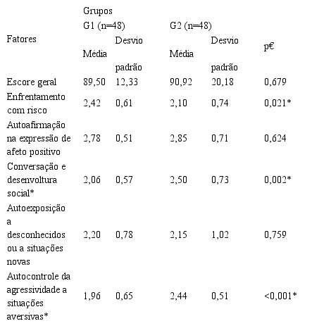 Para as médias do escore geral e fatorial das habilidades sociais, quando comparados os dois grupos, foram detectadas diferenças significativas. Verificaram-se médias significativamente mais elevadas no G2, em comparação ao G1, sobre Conversação e desenvoltura social e sobre Autocontrole da agressividade a situações aversivas. Também foram verificadas médias significativamente mais elevadas no G1, em comparação ao G2, sobre Enfrentamento com Risco (Tabela 2).
