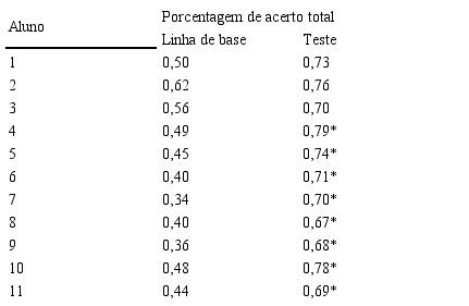 Os índices de concordância obtidos para cada uma das três combinações de duplas de juízes foram 93,44%, 88,52% e 80,32%. A Tabela 1 apresenta a porcentagem de acerto total de cada aluno para todas as categorias na linha de base e no teste. Considerando a porcentagem de acerto total, oito alunos (Alunos 4, 5, 6, 7, 8, 9, 10 e 11) melhoraram o desempenho da resposta de observação e três alunos (Alunos 1, 2 e 3) não melhoraram o desempenho da resposta de observação. No entanto, mesmo para cada um dos oito alunos que melhoraram o desempenho da resposta de observação, a porcentagem de acerto total na fase de teste foi inferior a 80%. Estes dados mostram a porcentagem de acerto total de cada aluno para todas as categorias e não consideram a variação de acertos que houve por categoria. Por este motivo, julgou-se importante verificar o efeito do treino levando-se em consideração a porcentagem de acerto de cada aluno para cada categoria, separadamente.