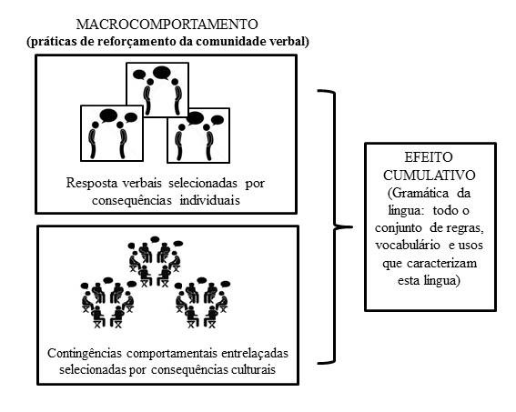 O uso da língua pelos falantes como um todo produzirá a gramática da língua em uso como um efeito cumulativo. Os falantes podem estar se comportando verbalmente sozinhos (em contingências individuais); em interações de pequenos grupos (em contingências comportamentais entrelaçadas); ou ainda, em atividades cooperativas com a produção de alguma modificação ambiental resultado dessa cooperação (metacontingências). Assim, uma língua viva, como um sistema estruturado, pode ser descrita como uma macrocontingência (ver Figura 1).