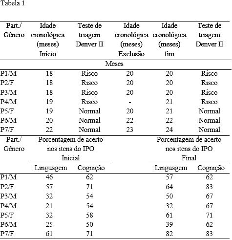 Quatro dos sete participantes (P1, P2, P3 e P4) apresentaram indicações de risco para atraso no desenvolvimento (fator motor-grosseiro) no Teste de Triagem Denver II (Pedromônico, Bragatto, & Strobilus, 1999), e os demais apresentaram desenvolvimento típico. Seis dos sete participantes (exceto P7) pontuaram abaixo de 80% nas áreas de linguagem e cognição em relação à estimativa do Inventário Portage Operacionalizado, IPO (Williams & Aiello, 2001). A Tabela 1 apresenta as características dos participantes (gênero, idade, resultados para o Denver II e o IPO).