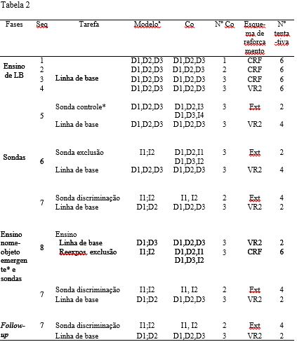 Nota Tabela 2. Seq=sequência de tarefas experimentais; Co=comparação; Nº Co=número de estímulos de comparação; Ensino de LB=ensino de linha de base; CRF=reforçamento contínuo; VR2=razão variável 2; Ext=extinção; Reexpos. exclusão=reexposição exclusão. Ensino nome-objeto emergente*= tentativas similares a tentativa de exclusão. Controle*: Se o participante não obtivesse critério nas sondas controle, era realizada uma sessão adicional para corrigir o controle pela propriedade novidade dos estímulos. aEstímulos definidos – D1= auau; D2= carro; D3= bola. Estímulos indefinidos – I1= dupa; I2= tabi.