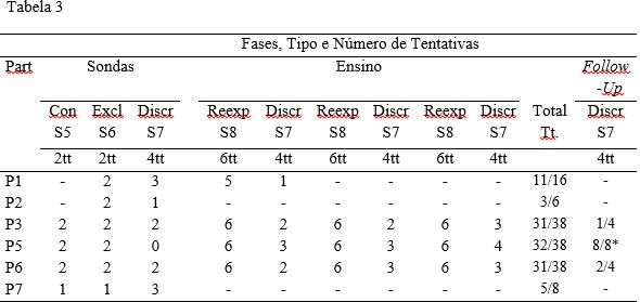 Nota Tabela 3. Part=participante; Con=controle; Excl=exclusão; Discr=discriminação; Reexp=reexposição exclusão; Total Tt.=número de acertos pelo número total de tentativas. S5=sonda controle; S6=sonda de exclusão; S7=sonda de discriminação; S8= ensino nome-objeto emergente; tt=número de tentativas. (*)=aprendizagem. (-)=o participante não realizou esta etapa. Na coluna Follow-up foram agrupados os resultados obtidos após três dias (P3 e P6) e dois e seis dias (P5) após a última sonda de discriminação.