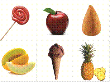 Para cada tentativa o experimentador apresentava um slide composto por seis fotos de alimentos (três de alimentos saudáveis e três de alimentos não saudáveis) e a criança apontava duas opções na ordem de preferência (Ver Figura 1). Além disso, a posição das fotos foi randomizada com o objetivo de evitar o controle pela posição das imagens dos alimentos. Cada conjunto era repetido apenas uma única vez respeitando as seguintes classes: Frutas vs. Doces e Salgados, Bebidas de Baixa Caloria vs. Bebidas de Alta Caloria e Pratos de Comida Colorida vs. Pratos de Comida Não Colorida. As escolhas eram feitas a partir da disponibilidade apresentada em cada slide, obedecendo a ordem de preferência da criança. O critério para avançar para a próxima fase era o término de todas as escolhas. Antes da criança realizar a escolha, a seguinte instrução era apresentada:
