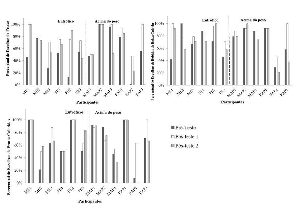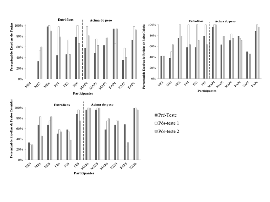 Na comparação entre o Pré-Teste com o Pós-Teste 1, da Condição I observou-se um aumento no percentual de escolhas das fotos de frutas para todos os participantes, com exceção de MAP2 que manteve as escolhas saudáveis constantes em todas as fases. Na categoria de bebidas de baixa caloria, 7 dos 12 participantes aumentaram o percentual de escolhas saudáveis e 3 mantiveram o mesmo percentual. Nas escolhas das fotos de pratos de comida colorida, a metade dos participantes apresentou um aumento no percentual de escolhas. Os meninos acima do peso (MAP1 e MAP2) foram os únicos que apresentaram uma diminuição nas escolhas das fotos de pratos de comida colorida (ver Figura 3).