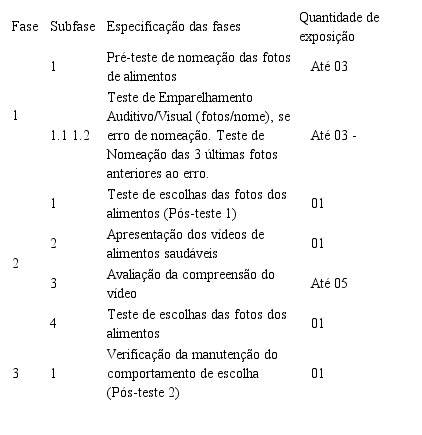 O delineamento foi divido em três fases (ver Tabela 1). A Fase I consistia no teste de nomeação das fotos dos 60 alimentos e bebidas. Se a criança nomeasse corretamente as fotos dos alimentos era conduzida à Fase II. Caso contrário, era aplicado o Teste de Emparelhamento Auditivo/Visual, nome do alimento e foto, solicitando-se a repetição oral do nome do alimento que era apresentado por três vezes. Após a repetição correta do nome aplicado no teste de emparelhamento, o participante retornava ao teste de nomeação e era submetido à nomeação das três últimas fotos dos alimentos que antecediam o erro. Caso o erro persistisse, após a terceira tentativa, o procedimento era reaplicado após 24 horas. Depois da reexposição a todo o procedimento e se os erros persistissem o participante era excluído da pesquisa. Após a nomeação de todas as fotos dos alimentos o participante era submetido à próxima fase.