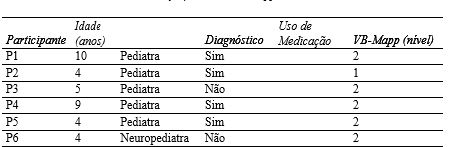 Participaram desta pesquisa seis crianças com o diagnóstico de TEA (Tabela 1). Todas as crianças apresentavam comportamentos de sessão (i. e., atendiam comandos, mantinham-se sentadas, olhavam para os estímulos da tarefa) e estavam inseridas no ensino regular. Nenhu-ma dessas crianças era alfabetizada.
