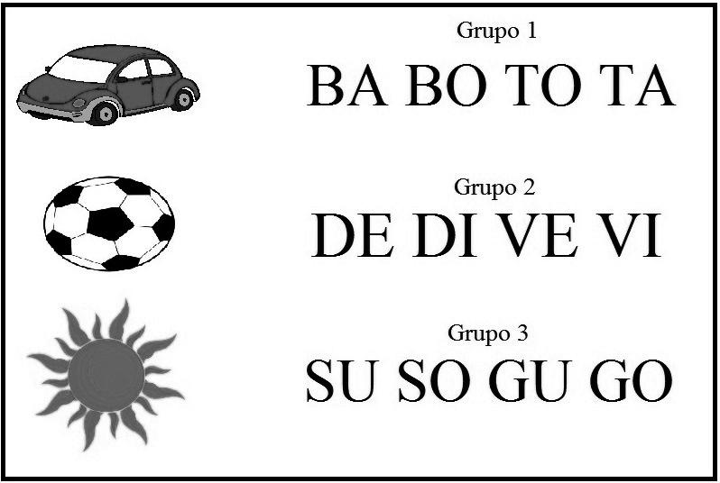 Os estímulos utilizados neste estudo foram (a) figuras conhecidas (SOL, BOLA e CARRO) e (b) sílabas (Figura 1). As figuras eram muito diferentes entre si, variando em tamanho, forma e cores. As sílabas foram escolhidas pela sua relevância acadêmica, por sua facilidade de identificação e foram divididas em três grupos (Figura 1).