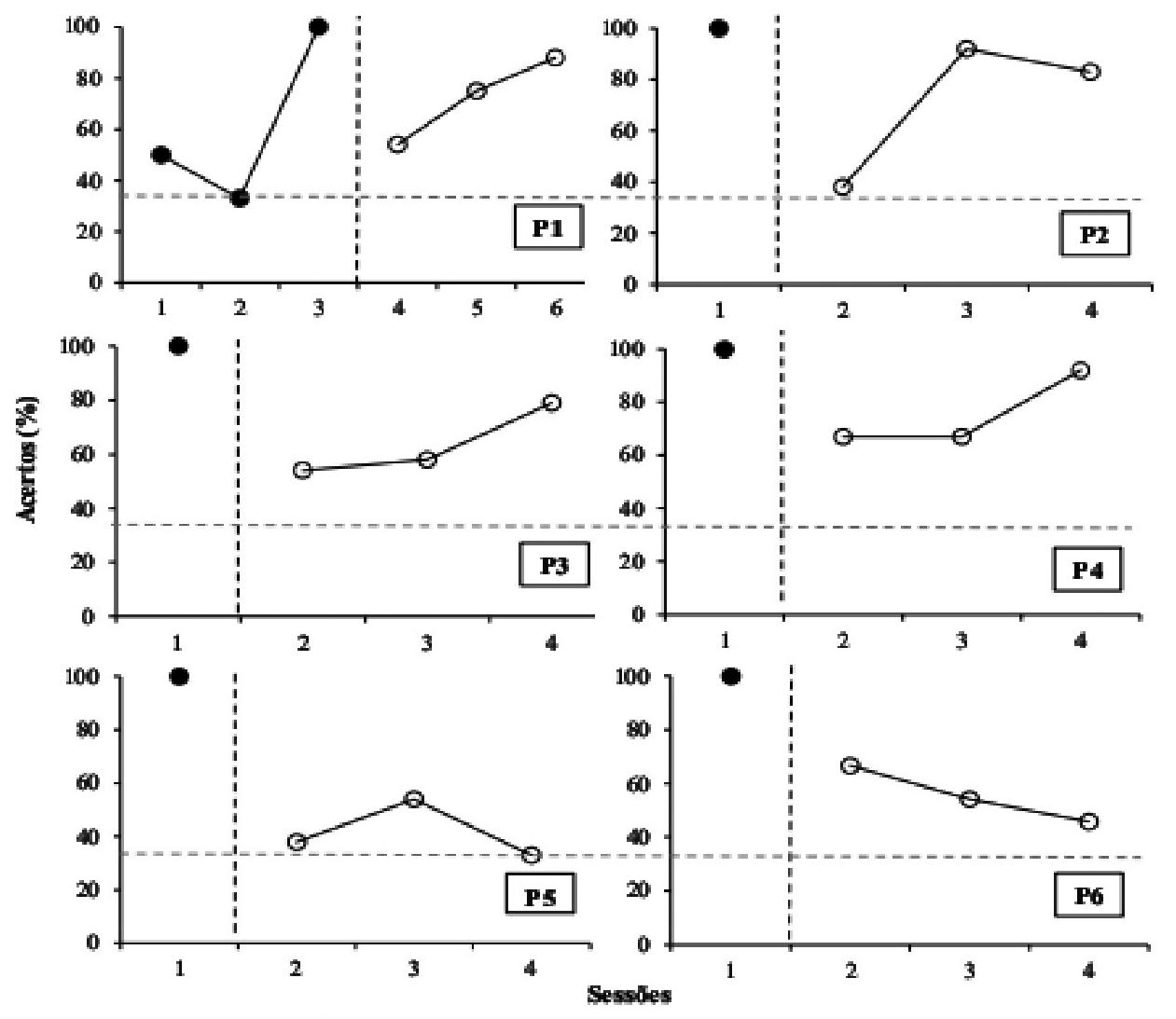 Quando se observa as taxas de acerto dos quatro primeiros participantes, percebe-se que houve melhora, de modo geral, no desempenho ao longo das exposições. Essa melhora pode ter ocorrido como resposta a novas contingências, mesmo sem consequências diferenciais. As crianças com diagnóstico de TEA podem apresentar dificuldades em generalizar responder aprendido anteriormente (MTS de identidade, no caso) a novas contingências (Spradlin & Brady, 1999), o que pode ter contribuído para o aumento gradual ao longo das sessões. Apesar disso, na maioria dessas sessões, mesmo com tendência crescente, os participantes obtiveram taxas de acerto com valores intermediários.