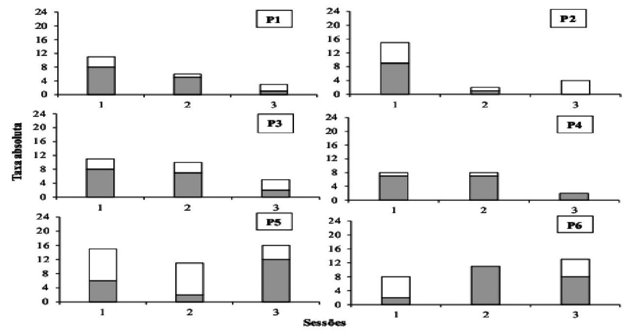 Nas sessões de Teste, todos os participantes apresentaram taxas de acerto com valores intermediários (P1-54%; P2-38%; P3-55%; P4-67%; P5-38% e P6-67%) na primeira sessão (Figura 4). Para os participantes P1, P3, P4, P5 e P6 essas taxas permaneceram com valores intermediários também na segunda sessão. Na terceira sessão de teste, o único participante que obteve taxa de acerto acima de valores intermediários foi o participante P4. Nessa sessão, apesar das taxas de acerto dos participantes P1 e P3 terem subido quando comparadas às da sessão anterior, ainda permaneceram com valores considerados como intermediários (acima de 33% e abaixo de 90%). Para o participante P2, houve um decréscimo na terceira sessão, retornando a um valor considerado como intermediário (83%). Para os participantes P5 e P6, houve decréscimo nessa última sessão. Para o participante P5 a taxa de acerto atingiu valores ao acaso e para o participante P6, atingiu um valor intermediário - 46% (Figura 4).