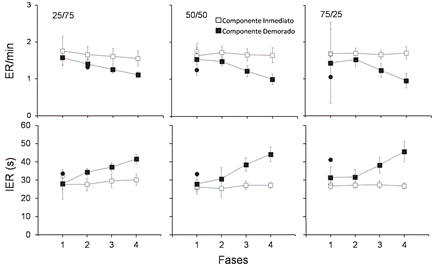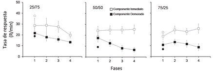 En la Figura 1 se presentan las tasas de respuesta promedio de cada grupo en cada una de las fases de demora de reforzamiento. De manera general, para los tres grupos se observó una tasa de respuesta más alta durante el componente inmediato comparado con el componente demorado, en las cuatro fases. La tasa de respuesta en el componente demorado mostró una tendencia decremental a lo largo de las fases para en los tres grupos. Este efecto también se observó en el componente inmediato para el grupo 25/75; para el grupo 50/50 la tasa de respuesta en el componente inmediato se mantuvo relativamente constante entre fases; mientras que para el grupo 75/25 se observó una tendencia incremental en dicho componente.