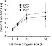 Fase experimental. Concluido el entrenamiento, se asignaron aleatoriamente tres sujetos a cada uno de tres grupos. Para cada grupo se mantuvo constante la proporción de reforzamiento inmediato/demorado (i.e. 25/75, 50/50, 75/25, respectivamente) a lo largo de todo el experimento y en fases sucesivas se alargó la duración de la demora. Durante la Fase 1 la demora fue de 2s, para la Fase 2 fue de 4s, para la Fase 3 fue de 8s y finalmente para la Fase 4 la demora fue de 16s. Únicamente para el componente demorado. A todos los sujetos se les presentó un programa múltiple IV t s -TF t s. A medida que se alargó la demora se adecuó la duración del IV para que en todas las condiciones el IER programado se mantuviera en 30 s. El programa IV se construyó con base en 18 intervalos derivados de la distribución de Fleshler y Hoffman (1962) seleccionados aleatoriamente sin remplazo. Al finalizar todas las condiciones, se redeterminó la Fase 1 de demora 2 s. Cada fase estuvo en efecto durante 30 sesiones, dichas sesiones se condujeron diariamente.