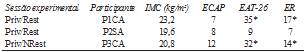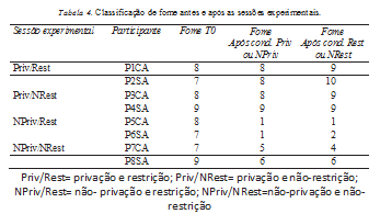 Cada uma das quatro sessões experimentais (Priv e Rest, Priv e NRest, NPriv e Rest, NPriv e NRest) foi realizada separadamente com duas participantes sendo que uma delas apresentou alteração nos testes psicométricos (classificada com alteração – CA, indicando um comer transtornado) e a outra com ausência de alteração nos testes psicométricos (classificada sem alteração - SA). As condições experimentais as quais cada participante foi submetida foi descrito na Tabela 1.