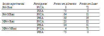 As participantes P2SA (Priv/Rest) e P4SA (Priv/NRest), ambas submetidas à condição de Privação pontuaram mais para alimento enquanto as participantes P6SA (NPriv/Rest) e P8SA (NPriv/NRest) pontuaram mais para lazer e alimento, respectivamente, após a condição de Não-Privação (Tabela 3). Embora a diferença/magnitude da pontuação da participante P4SA tenha sido de 3 pontos a mais para alimento, entendemos que esta diferença passa a ser relevante diante do número de toques a mais que foram realizados para alcançar os 3 pontos, pois havia uma dificuldade maior (pelo esquema de razão variável encadeada) para obter pontos em alimentos. As demais participantes apresentaram uma diferença expressiva entre a pontuação para alimento ou lazer.