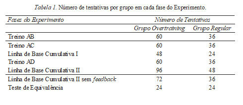 Com o objetivo de controlar a quantidade de tentativas de treino a qual foram expostos os participantes em cada um dos grupos, não houve critério de aprendizagem em cada treino e os participantes foram expostos uma única vez a cada uma das fases de treino e testes pro- postos no experimento.