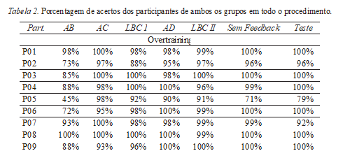 A análise dos dois participantes restantes que não formaram classes, P05 do Grupo Overtraining e P25 do Grupo Regular, indica que o baixo desempenho no teste ocorreu devido a retirada das consequências programadas no treino de Linha de Base Cumulativa II sem fee- dback, pois os participantes apresentavam bons desempenhos nas fases anteriores de treino. Portanto, para esses dois participantes, a variável crítica para o baixo desempenho nos testes não foi a quantidade de tentativas, mas sim a retirada das consequências reforçadoras. Estudos futuros poderiam realizar um treino de linha base sem submeter os participantes a um treino cumulativo sem feedback, aumentando, dessa maneira, o controle da variável overtraining.