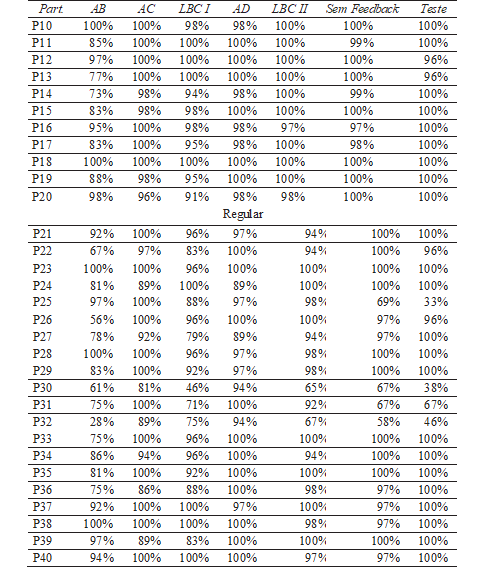 Para ambos os grupos, os menores índices de acertos ocorreram na primeira fase de treino (treino AB). O desempenho dos participantes nas referidas relações AB, entretanto, melhorou ao longo das fases de treino. A exceção ficou por conta dos participantes P30, P31 e P32 do Grupo Regular, os quais também não formaram classes. A maioria dos erros apresentados por esses participantes nos treinos de Linha de Base Cumulativa ocorreram em tentativas da relação AB.