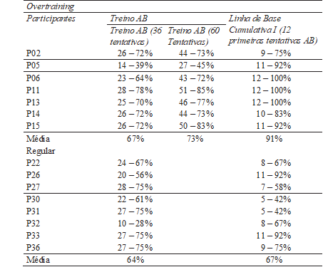 A Tabela 3 apresenta o percentual de acertos nas relações AB durante os treinos AB e Linha de Base Cumulativa I para todos os participantes de ambos os grupos que obtiveram desempenho abaixo de 80% de acertos nas 36 primeiras tentativas do treino AB. A porcentagem média (M) de acertos dos participantes do Grupo Regular foi de 64% (com desvio padrão – DP – de 17), semelhante à porcentagem média de acertos dos participantes do Grupo Overtraining nas 36 primeiras tentativas do treino AB, que foi de 67% (DP=13). Quando se considera todas as 60 tentativas de treino AB do Grupo Overtraining, observase um aumento médio no percentual de acertos de 6% (de 67% para 73%), mas, mesmo assim, a maioria (cinco entre sete) dos participantes apresentou desempenho abaixo de 80% de acertos no treino AB. De fato, o desempenho desses cinco participantes (P02, P05, P06, P13 e P14) em 60 tentativas foi semelhante ao da maioria dos participantes do Grupo Regular no treino AB. A diferença entre os grupos (Tabela 3) se mostra no treino de Linha de Base Cumulativa I. A porcentagem média de acertos nas 12 primeiras tentativas das relações AB do Grupo Over- training (M=91%; DP=9,62) foi superior à do Grupo Regular (M=67%; DP=19,42).