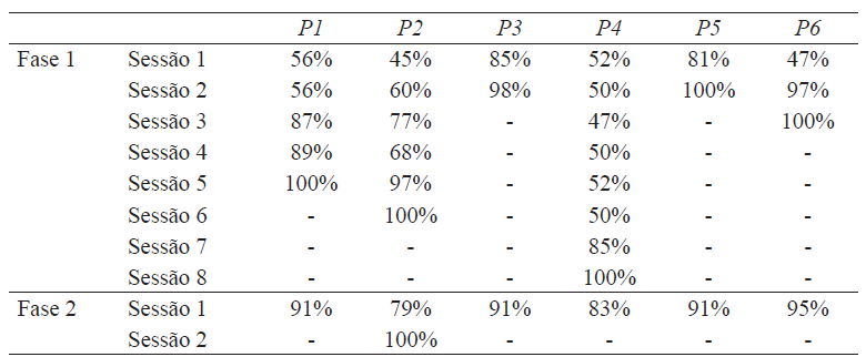 Na Fase 2, apenas, o participante P2 precisou de uma segunda sessão de treino para atingir o critério de passagem de fase (22 de 24 respostas corretas, ou seja, uma acurácia de 91%). O participante P4 atingiu um escore de 83% de respostas corretas na Fase 2. Entretanto, como os erros ocorreram apenas nas primeiras 4 tentativas da sessão, não foi necessário conduzir mais uma sessão de treino de discriminação sucessiva com respostas diferenciais.
