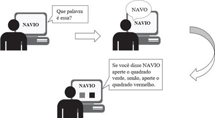 Pré-Treino. Nessa condição foram ensinadas às crianças a sequência comportamental requerida no presente estudo: fazer (ler) e dizer (relatar por meio dos quadrados). Durante essa condição, o experimentador estava presente, sentado em uma cadeira ao lado da criança. A tentativa tinha início com uma palavra impressa sendo apresentada no centro da tela com a reprodução simultânea da seguinte mensagem (mensagem 1): “Que palavra é esta? ”. Após a emissão de uma resposta verbal pelo participante (leitura correta ou incorreta ou, ainda, uma resposta do tipo “não sei”), a palavra impressa permanecia no centro da tela e eram apresentados dois quadrados coloridos logo abaixo da palavra, lado a lado, sendo um quadrado verde e o outro vermelho. Neste momento, a seguinte mensagem (mensagem 2) era reproduzida: “Se você disse XXXX (leitura da palavra) aperte o quadrado verde, se não, aperte o quadrado vermelho”. Após a seleção de um dos quadrados pelo participante, a tentativa era encerrada e uma nova tentativa, com outro estímulo, era apresentada em sequência (Figura 1). A seleção de um dos quadrados correspondia ao autorrelato sobre o desempenho na leitura, ou seja, a seleção do quadrado verde significava que a criança havia considerado sua leitura como correta e a seleção do quadrado vermelho, como incorreta.