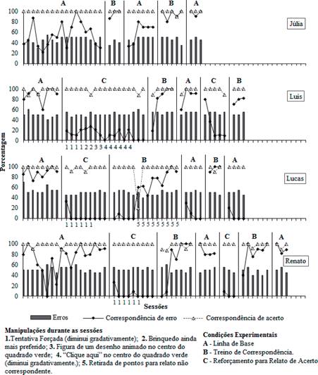 Quando retornaram para as sessões de Linha de Base, Luís e Renato mostraram alta correspondência de relatos de erro (manutenção) e foram, então, expostos à condição de Reforçamento para Relato de Acerto, na qual a porcentagem de relatos correspondentes diminuiu. Júlia e Lucas, por sua vez, apresentaram, no retorno à Linha de Base, diminuição nos níveis de correspondência (70% ou menos), sendo reexpostos ao Treino de Correspondência. Nessa condição, os níveis de relatos correspondentes de erro aumentaram (incluindo a reexposição de Renato a esse treino).