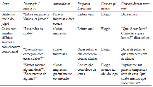 Foram realizadas nove sessões de intervenção e, em cada sessão, o participante jogava com uma das três palavras de ensino que compunham o bloco. Para a intervenção utilizou-se o jogo de tabuleiro AbraKedabra: construindo palavras (Souza, 2007 – Versão 2), adaptado para atender aos objetivos desta pesquisa. Nas sessões de intervenção o participante jogou com a pesquisadora. Inicialmente os componentes do jogo foram apresentados ao participante, como peões, tabuleiro e cartas. Em seguida a pesquisadora leu a história do jogo, que descreve o enredo e explica o que os jogadores precisam fazer para ganhar: “Pedro é um menino muito dedicado e gosta de estudar. Todos os dias ele passa por uma trilha encantada em uma floresta a caminho da escola, mas hoje ele perdeu algumas partes de sua tarefa pelo caminho. Vamos ajudá-lo? Encontre pelo tabuleiro: (a) as sílabas para compor a palavra de Pedro, (b) uma figura que combine com a palavra; mas cuidado! Muitos desafios o aguardam, porque essa floresta é encantada!”. O participante foi então convidado a jogar. Cada jogador recebeu um cartão com uma palavra que compunha o bloco de palavras: uma para o participante e outra para a pesquisadora (e.g., o participante ficou com a palavra CREPE e a pesquisadora com a palavra PEDRA). A pesquisadora leu corretamente cada palavra e pediu que o participante repetisse o que foi lido (comportamento textual com dica ecóica). Cada jogador (pesquisador e participante) posicionou seu peão na Casa Início, jogou o dado e moveu o peão pelo número de casas correspondente ao número apresentado no dado. No jogo, em cada casa, havia uma atividade a ser cumprida pelo participante (ver Tabela 2). Após a execução correta das atividades, elogios eram liberados e o jogador poderia prosseguir no jogo. A execução incorreta da atividade era seguida de instruções sobre como realizá-la. Todas as instruções e auxílios foram esvanecidos ao longo das sessões, i.e., inicialmente instruções completas eram fornecidas com auxilio (instruções que descreviam o contexto, o comportamento a ser executado e as consequências da execução correta com realização da atividade pelo pesquisador), depois instruções completas eram fornecidas sem auxilio, em seguida apenas instruções parciais (instruções que descreviam apenas o comportamento a ser executado) e finalmente nenhuma instrução era dada (participante executava as atividades de maneira independente). Por meio do jogo foram ensinadas as relações entre: palavra impressa e palavra falada (leitura oral – BA’); palavra impressa e conjunto de letras (cópia por construção - BE); palavra falada pelo pesquisador e conjunto de letras (ditado por construção - AE); palavra impressa e figura (BC); palavra falada pelo pesquisador e figura (AC); soletração (AF e BF); palavra impressa-escrita manuscrita (BD); palavra falada-escrita manuscrita (AD); sílaba falada pelo pesquisador ou participante e sílaba impressa (GH); sílaba impressa-conjunto de letras (HE), palavra falada pelo pesquisador e palavra falada pelo participante (AA’) e sílaba impressa e sílaba falada pelo participante (HA’).