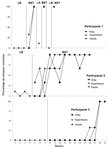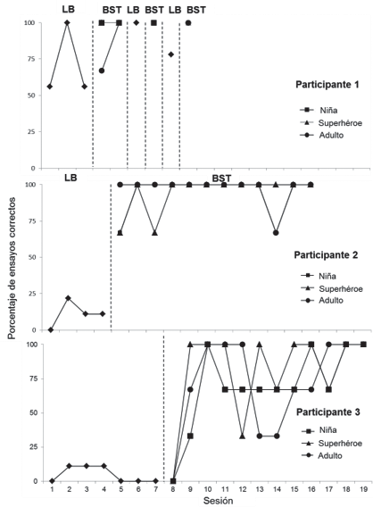 En la Figura 1 se muestra el porcentaje de ensayos correctos de los tres participantes durante la Línea Base y la fase de BST con los tres tipos de modelo para la variable de acercamiento al actor. La serie de datos que corresponde a la Línea Base se muestra con un rombo. La serie de datos que corresponde a la niña se muestra con cuadrados, al superhéroe con triángulos y al adulto con círculos. En el panel superior se muestran los datos del Participante 1, en el panel medio se muestran los datos del Participante 2 y en el panel inferior se muestran los datos del Participante 3.