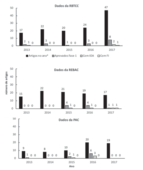 Na Figura 1 se encontra uma análise que revela o número de artigos publicados por ano, quantos deste foram aprovados na Fase 1 e, dentre estes, quantos tinham medidas e relatos de IOA e FI. Conforme pode ser observado, não há uma tendência geral, nos três periódicos de aumento na presença de IOA e FI com o passar dos anos.