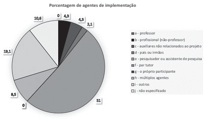 A segunda pergunta foi em relação ao agente de implementação do tratamento (McIntyre et al., 2007) o qual se refere a quem (ou o que) implementou as variáveis independentes (intervenção). Tais agentes foram classificados de acordo com as seguintes categorias (mutuamente exclusivas): (a) professor de Educação Infantil, Ensino Fundamental ou Ensino Médio, (b) profissional (não-professor), (c) auxiliares, assistentes ou estagiários (não relacio- nados ao projeto de pesquisa), (d) pais ou irmãos, (e) pesquisador ou assistente de pesquisa, (f) par tutor, criança da mesma faixa etária, comumente com desenvolvimento típico, (g) o próprio participante, (h) múltiplos agentes, ou seja, vários dos anteriores, (i) outros, ou seja, nenhum dos descritos acima, ou (j) não especificado. Exemplos da categoria (a) incluíam professores de escolas regulares e de instituições especializadas na prestação de serviços para pessoas com deficiências (excluindo-se as universidades). A categoria (b) incluía profissio- nais não professores (por exemplo, psicólogos, fonoaudiólogos, fisioterapeutas etc). Assis- tentes, auxiliares e estagiários, (c), incluíam equipe de apoio (p. ex., auxiliar de sala de aula, professores assistentes, monitores e estagiários de curso de graduação não relacionados à pes- quisa). A categoria (d) era composta por familiares dos participantes. A (e) eram pessoas que coletavam dados para o propósito do estudo e não estavam envolvidos com outros papéis de prestação de serviços. Um par tutor (f) era uma outra criança, normalmente da sala da criança- alvo, que não era o foco da intervenção. A categoria (g) era quando o próprio participante administrava ou mediava a implementação do tratamento. Múltiplos agentes (h) descrevia o fato de mais de uma categoria anterior ter sido utilizada. Se o agente de implementação descrito no estudo não coubesse em nenhuma das categorias descritas anteriormente, “outros” era utilizado. Houve alguns estudos que não especificaram o agente implementador e foram denominados “não especificados”.