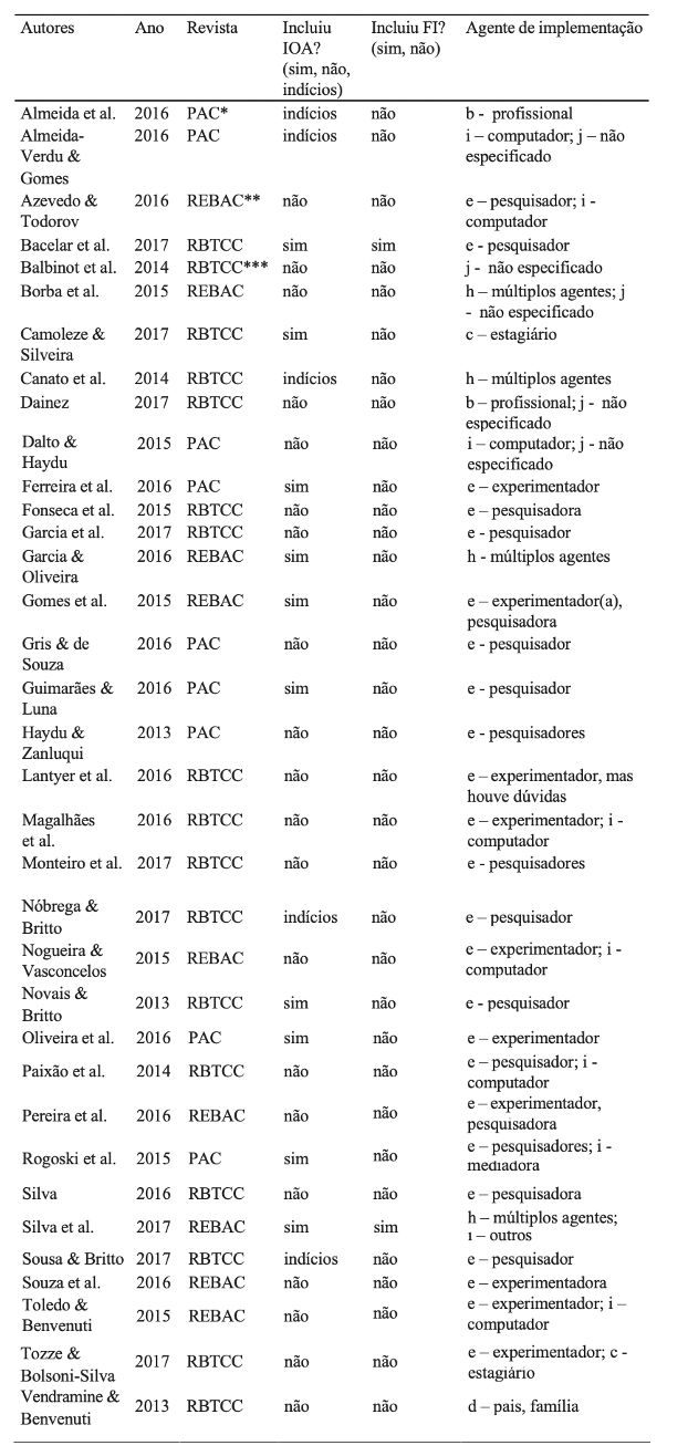 Para a análise de IOA e da FI, foram revisados três periódicos brasileiros de Análise do Comportamento (Perspectivas em Análise do Comportamento - PAC, Revista Brasileira de Análi- se do Comportamento - REBAC, Revista Brasileira de Terapia Comportamental e Cognitiva- RBTCC). A base para esta decisão foi o artigo de Strapasson, Zuge e da Cruz (2017), o qual define que estes periódicos anunciam “preferência ou exclusividade na publicação de textos em Análise do Comportamento” (p. 98). Para realizar a análise, foi feito o download de todos os arquivos presentes no sítio da revista. Foram lidos o resumo, a introdução e o método de cada arquivo para a realização da análise de inclusão descrita abaixo.