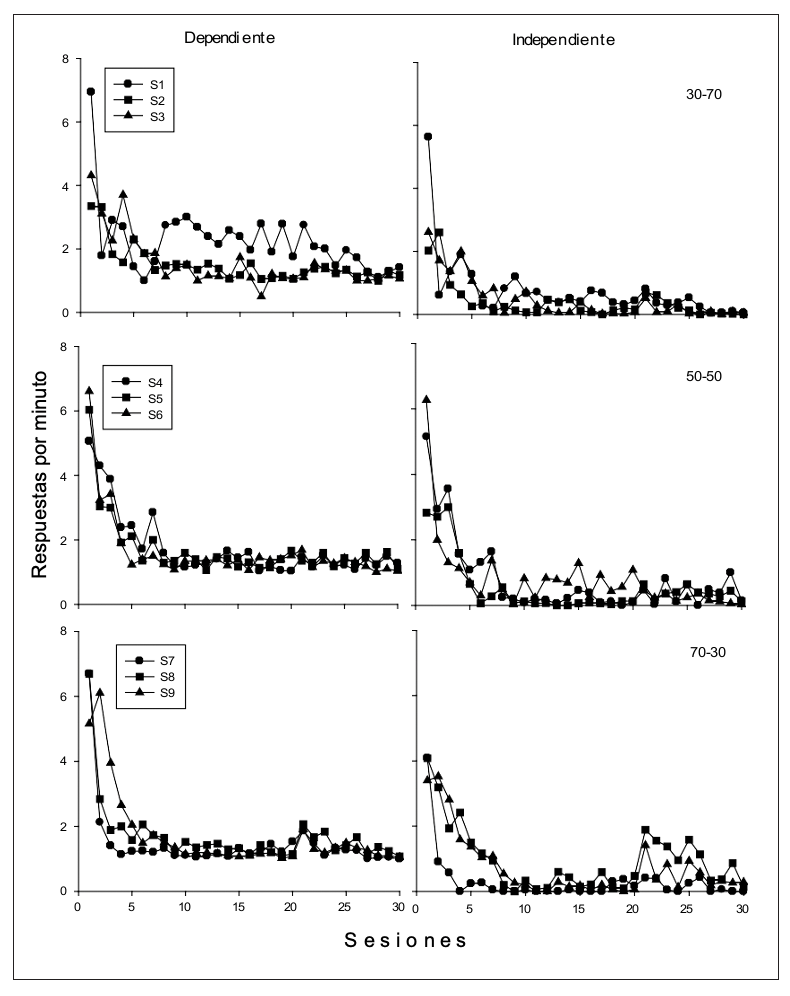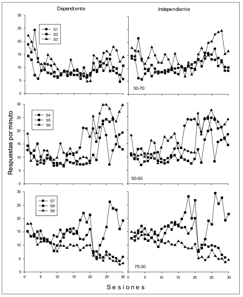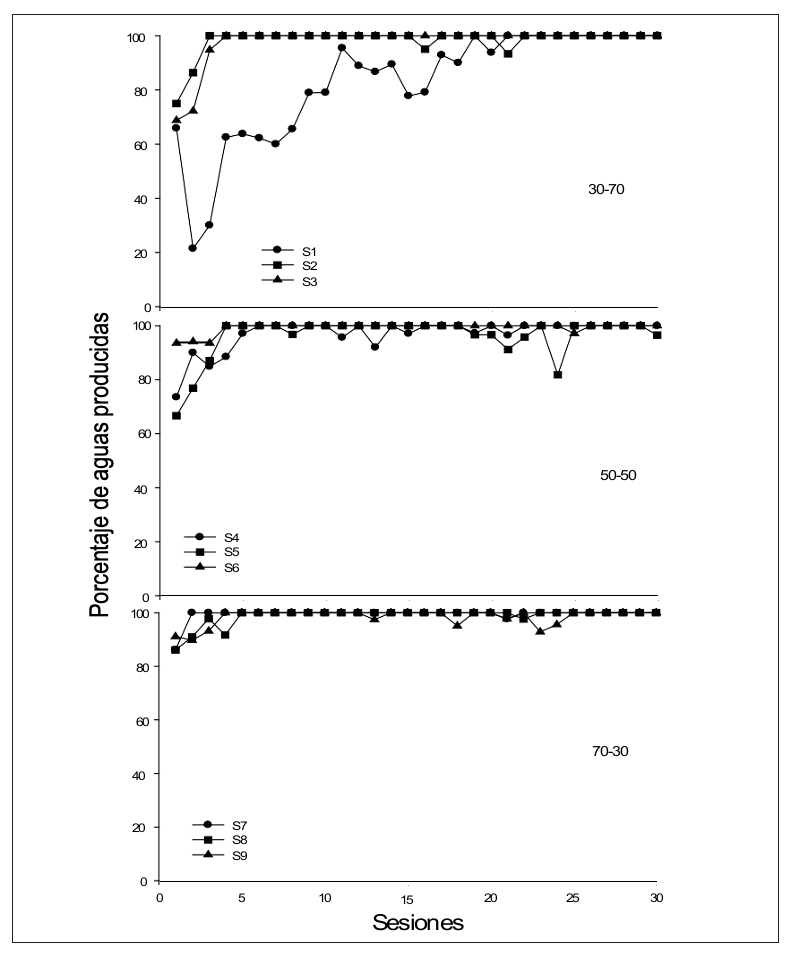 En la Figura 5 se presenta el porcentaje de aguas producidas (dependientes de la respuesta) por sesión para cada uno de los sujetos en los tres grupos. De manera general se puede observar que sin importar la proporción de ciclos dependientes e independientes, el porcentaje de aguas se mantiene relativamente estable entre el 80% y el 100% en la mayoría de los sujetos y desde las primeras sesiones, excepto el Sujeto S1 del Grupo 30-70 en el que es hasta después de la sesión 15 que el porcentaje de aguas obtenidas es consistentemente superior al 80 %.