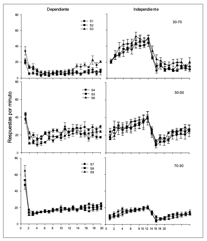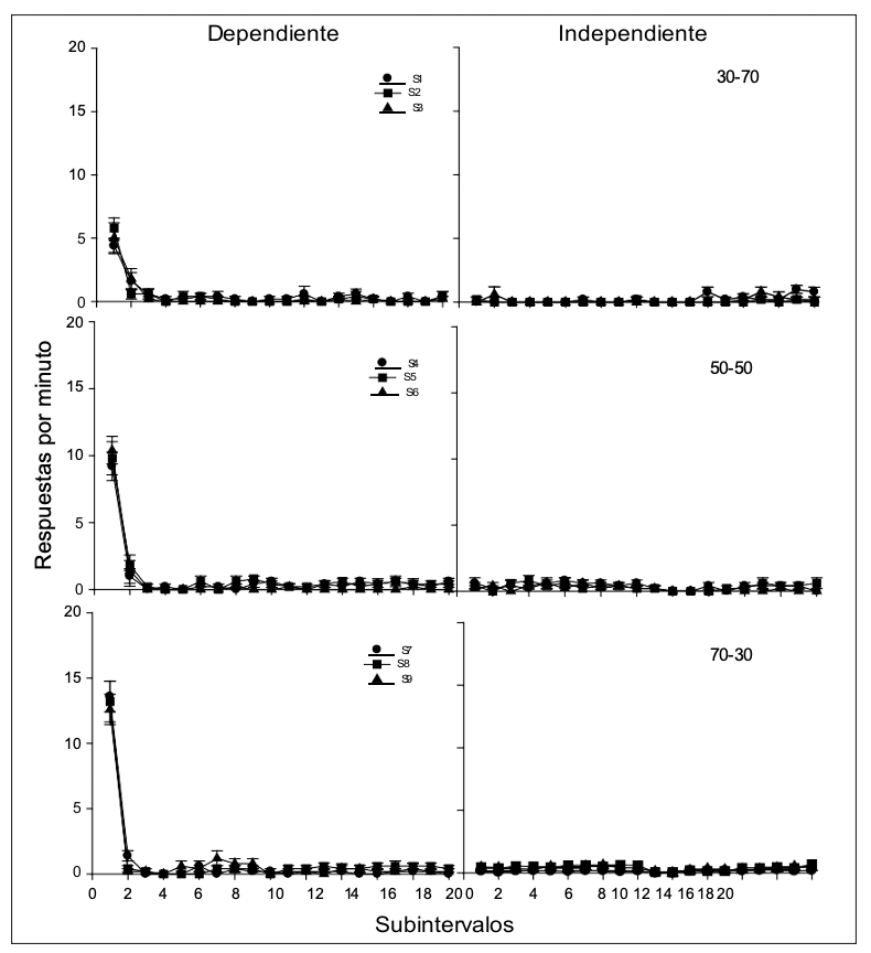 En otro trabajo, Lattal y Maxey (1971) utilizando un programa múltiple de dos componentes, variaron entre fases las condiciones de reforzamiento dependiente e independiente de la respuesta. En una primera fase se programó el reforzador de manera dependiente en ambos componentes (IV 60 s – IV 60 s), en la segunda fase uno de los componentes cambió a reforzamiento independiente (IV 60 s – TV 60 s), mientras que durante la tercera fase ambos componentes entregaron el reforzador de manera independiente de la respuesta (TV 60 s – TV 60 s). Los autores identificaron que, al pasar de la Fase 1 a la Fase 2, la tasa de respuesta decrementó en el componente que cambió de reforzamiento dependiente (IV) a reforzamiento independiente (TV). Cuando en ambos componentes se programó el reforzador independiente de la respuesta (Fase 3) se observaron decrementos en la tasa de respuesta hasta llegar a niveles cercanos a cero.