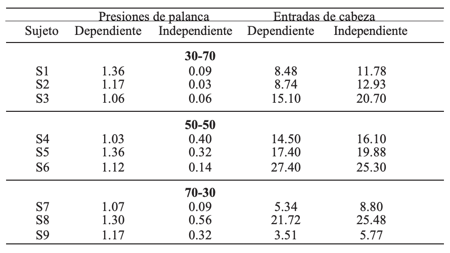 En la Tabla 1 se presenta la tasa de respuesta por sujeto, promedio de las últimas cinco sesiones, tanto de las presiones a la palanca como de las entradas de cabeza para cada tipo de ciclo. De manera consistente se encontró que la tasa de respuesta de presión a la palanca fue mayor en los ciclos con agua dependiente de la respuesta, no se identifican diferencias sistemáticas por variar la proporción de ciclos. En el caso de las entradas de cabeza se identifica un efecto inverso, es decir, la tasa de respuesta en los ciclos con agua independiente de la respuesta es consistentemente superior a la tasa en los ciclos con agua dependiente, excepto el Sujeto S6.