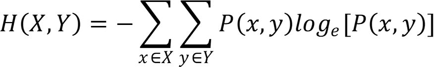 Respecto a la evaluación de la variación en el desplazamiento de las ratas a través del espacio experimental, se propone el uso de un indicador que permitiera la representación del grado de variación en un solo valor y facilitar así la apreciación de la magnitud de la variación del desplazamiento a través de todas las sesiones. Para dicho fin, se utilizó un cálculo de entropía. El término deriva del griego εν (en: “dentro”) and τρoπη (trope: “cambio”) y, si bien, en el origen de su uso hacía referencia a cambios de energía dentro de un sistema, otra interpretación es como una medida de la cantidad esperada de información en un sistema, de tal manera que a mayor entropía es posible asumir mayor cantidad de información en el sistema (Huffaker et al., 2017). En cuanto a la utilidad del cálculo de entropía en el contexto del presente estudio, es posible asumir que la ubicación de la rata momento a momento a través de su desplazamiento por la cámara experimental corresponde con la formalización de un sistema que cambia de estado momento a momento y que en virtud del grado de variación (tanto en la ubicación, como de la frecuencia relativa con la que se repite cada ubicación) el nivel de entropía será mayor o menor. En la situación actual, el desplazamiento de la rata está dado por su posición en las coordenadas X-Y de la cámara experimental, de tal manera que las ubicaciones dependen de identificar el estado del sistema a partir de dos variables (posición en X y posición en Y), y proceder a cuantificar la frecuencia relativa de cada ubicación dada. Para ello, se calculó para cada sesión de cada fase experimental el valor de entropía conjunta mediante la Ecuación 1:
