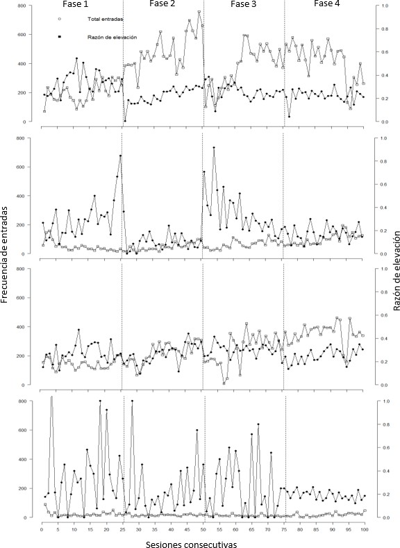 En la Figura 7 se contrastan el total de entradas al bebedero por sesión contra la razón de elevación, calculada cómo el número de entradas durante el tono entre el número de respuestas en el resto del intervalo (cf. Wiltgen, et al. 2012). Se eligió esta manera de calcular la razón de elevación, debido a la posibilidad de hacer comparaciones más o menos justas entre los 5 segundos que duraba la presentación del tono y el resto del intervalo aún para la situación en la que el tono ocurría aleatoriamente en algún segmento del ciclo entre entregas de agua. Podría haberse empleado otro método, por ejemplo, en el que la razón se calcula a partir de las respuestas durante el estímulo sobre las respuestas que ocurrieron en el período inmediato anterior de la misma duración (e.g., Bueno & Álvarez, 2001); no obstante, en la condición de emparejamientos aleatorios habría sido imposible tener un punto de comparación con la situación en la que el tono ocurría durante los primeros 5 segundos del ciclo. En el eje horizontal se muestran las sesiones a través de las fases experimentales, el eje vertical izquierdo corresponde al total de entradas (serie de círculos vacíos) y el derecho a la razón de elevación (serie de cuadros negros). Mientras que se observó una tendencia ascendente de la frecuencia total de entradas al bebedero en tres de las cuatro ratas (R1, R2 y R3) a través del paso del tiempo, se observaron razones de elevación más o menos constantes a lo largo de las sesiones, excepto en el caso de la rata R2 para la que se observó una razón de elevación más alta en las dos fases en las que estuvo presente el tono (contiguo o no a la entrega de agua). Debe tomarse en cuenta que en las Fases 2 y 4, la razón de elevación se calculó “como si” se hubiera presentado el tono antes de la entrega de agua o en algún otro momento (Fase 2 y 4, para las ratas R1 y R2, y Fases 4 y 2, para las ratas R3 y R4, respectivamente), aunque en realidad sólo hubo entrega de agua. En el caso particular de la rata R4 se encontraron razones de elevación más altas que en las otras tres ratas, sin embargo, debe tomarse en cuenta el posible artefacto debido al bajo número de respuestas totales.