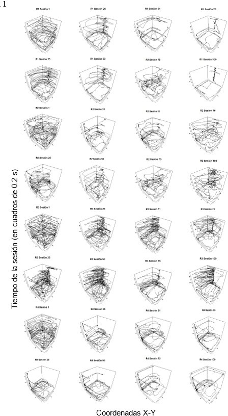 En la Figura 1 se representa la direccionalidad mediante las rutas analógicas de cada rata (cada par de renglones) en la primera y última sesión de cada fase experimental. En cada columna de gráficos se muestran las rutas correspondientes a cada fase experimental, mientras que cada par de renglones corresponden a la primera y última sesión de cada una de las ratas (es decir, primer y segundo renglón para la Rata 1, tercero y cuarto para la Rata 2, quinto y sexto para la Rata 3 y séptimo y quinto en para la Rata 4). En cada gráfico los ejes X y Y representan el plano de la caja experimental mientras que el eje Z representa el paso del tiempo de la sesión (de abajo hacia arriba). Se puede observar una mayor diversificación de las rutas en la primera fase para todas las ratas, particularmente en la primera sesión en la que el desplazamiento se distribuyó principalmente en el perímetro del espacio experimental, aunque también se observaron cruces por el resto del espacio. Conforme avanzaron las sesiones se observaron cambios en la direccionalidad del desplazamiento de las ratas, caracterizada por el hecho de que las rutas comenzaron a concentrarse en el área cercana a la pared dónde se encontraba colocado el bebedero (pared derecha en el fondo de cada gráfico), así como en las zonas adyacentes. Se puede observar que la densificación de los patrones de desplazamiento alrededor del área del bebedero y zonas adyacentes durante la mayor parte de la sesión fue más notable en las Fases 2 y 4. En las condiciones en las que estuvo vigente la presentación de un tono (Fases 1 y 3), contiguo a la entrega de agua o en alguno de los seis periodos que dividían el intervalo entre entregas de agua, el desplazamiento se diversificó por más áreas de la arena experimental, sin importar la constancia o variación del intervalo tono-agua. En casi todas las fases experimentales la rata R4 se mantuvo principalmente en una de las esquinas de la pared opuesta a la pared en la que se encontraba el dispensador de agua.