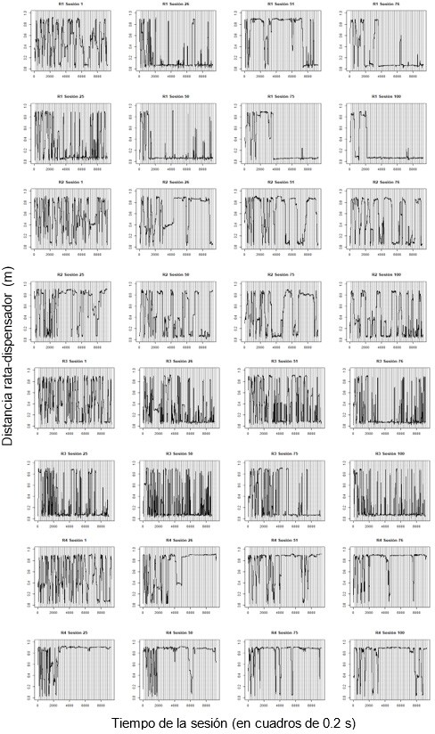 En la Figura 2 se muestra la distancia rata-dispensador como medida de Proximidad para cada sujeto (pares de filas) en la primera y última sesión de cada una de las cuatro fases experimentales (columnas). En el eje .se muestra el tiempo de la sesión en muestreos cada 0.2 segundos (9000 muestreos), mientras que en el eje . se muestra la distancia en metros. Se puede observar que en la primera sesión la distancia varió notablemente entre la distancia mínima y máxima para las cuatro ratas. A partir de la última sesión de la primera fase, la distancia rata-dispensador siguió variando aunque incrementó la cantidad de tiempo que las ratas se mantuvieron cercanas al bebedero, de manera más continua para la rata R1 que para las ratas R2 y R3. En el caso de la rata R4, su distancia respecto al dispensador fue cercana al máximo la mayor parte del tiempo, lo cual es consistente con lo observado en la Figura 1, en donde se apreciaba que la rata se encontraba principalmente en una esquina lejana al dispensador. En general, para todas las ratas, no se observan diferencias evidentes entre sesiones.