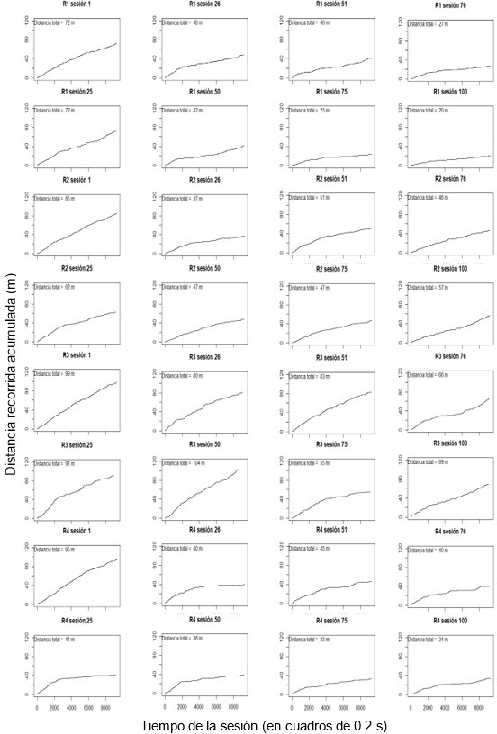 En la Figura 3 se presenta, como medida de vigor, la distancia recorrida acumulada a través del paso del tiempo de la primera y última sesión de cada rata (filas) en cada una de las fases (columnas). En cada panel, se presenta también el total de distancia recorrida por sesión en la esquina superior izquierda. De manera consistente con las medidas antes presentadas referentes a la direccionalidad, tanto la distancia total recorrida por sesión como la tasa local de velocidad a lo largo de cada sesión (i.e, altura máxima y pendiente de cada curva, respectivamente) fue mayor en la primera sesión de cada rata, así como en la primera fase sin importar si se comenzaba con la fase de intervalo T-A constante o variable. Se observaron tendencias y patrones de distancia recorrida semejantes para las cuatro ratas, independientemente de las condiciones presentes en las Fases 2, 3 y 4.