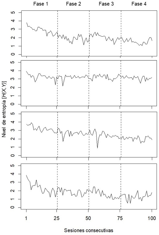 (1)en donde, X y Y se refieren a la posición de la rata de acuerdo con las coordenadas de los ejes de la cámara experimental, de tal manera que se calcula la sumatoria de los productos resultantes de multiplicar la frecuencia relativa para cada una de las coordenadas [P(x,y)] en las que se ubicó la rata a lo largo de la sesión (en cuadros de 0.2 s) por el logaritmo natural de dicha frecuencia relativa. Para el cálculo de esta medida se hizo una discretización de 10 intervalos para X y Y, por lo que se contabilizaron las frecuencias de localización en cada una de 100 áreas que segmentaron virtualmente el espacio experimental y en donde el grado máximo de variación quedaría acotado por el valor 4.60, resultante de la posibilidad de las ratas hubieran estado en cada una de las coordenadas exactamente el mismo número de veces [i.e., loge(100)], y 0 como valor mínimo, en el caso de que las ratas hubieran estado en la misma coordenada durante toda la sesión [i.e., loge(1)]. Para facilitar el cálculo de este valor a través de todas las sesiones de las cuatro ratas, se empleó el paquete entropy en R (Hausser & Strimmer, 2009). En la Figura 4 se muestran, en el eje horizontal, las 100 sesiones dividas en las 4 fases del experimento, mientras que el eje vertical representa el nivel de entropía calculado según la Ecuación (1). Los datos de cada sujeto se muestran en cada fila de la figura. Las líneas punteadas señalan el cambio de condiciones entre fases. Se encontró una tendencia decreciente del valor de entropía a lo largo de las sesiones, siendo más notable en las ratas R1, R3 y R4. Esta observación se interpreta como una disminución constante de la variación de la conducta a lo largo del experimento, sin cambios atribuibles a las condiciones presentes en cada fase experimental.