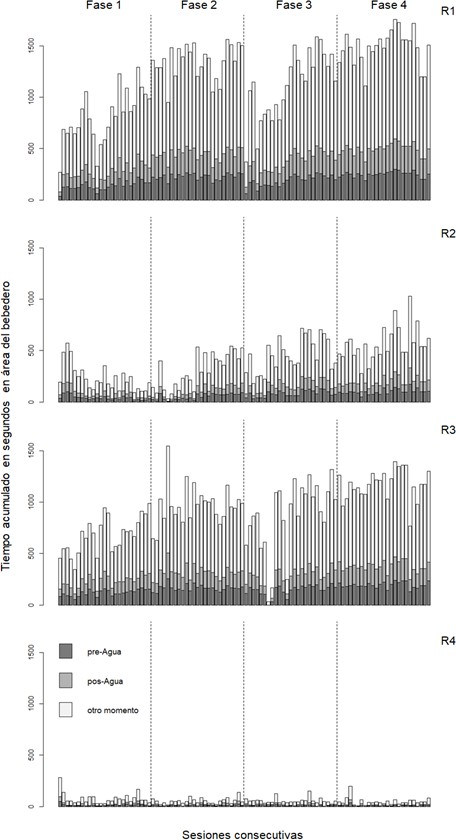 En la Figura 5 se muestra, como medida de preferencia, el tiempo acumulado de visitas al área del bebedero (distancia menor o igual a 10 cm en cualquier ángulo respecto a las coordenadas de ubicación del dispensador). En cada panel se muestran tres barras apiladas para cada una de las 100 sesiones, en donde la barra más oscura representa el tiempo acumulado en segundos en el área del bebedero durante los periodos de 5 segundos previos a cada entrega de agua, la barra de tono intermedio representa el tiempo acumulado durante los periodos de 5 segundos posteriores a cada entrega de agua y la barra más clara muestra el tiempo acumulado en el área del bebedero durante los periodos de los segundos 6 a 25 de cada ciclo de tiempo, de tal manera que la sumatoria de las tres barras puede interpretarse como el tiempo total acumulado por sesión de la permanencia en el área del bebedero. En general, se encontró un aumento del tiempo total de permanencia en las cercanías al bebedero a lo largo de las sesiones en tres de cuatro ratas (R1, R2 y R4). De manera más específica, se encontró que la permanencia en el área del bebedero fue de menor a mayor en cada uno de los periodos en los que se segmentó el intervalo entre entregas de agua, siendo ligeramente más notable el incremento del tiempo de permanencia durante los cinco segundos previos a la entrega de agua que durante los periodos posteriores a la entrega para las mismas tres ratas.