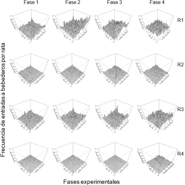 En la Figura 6 se muestra, como medida de persistencia, la frecuencia acumulada de entradas al bebedero (Eje .) agrupadas en subintervalos (bins) de 1 segundo (Eje Z) para cada una de las 25 sesiones (Eje .) de cada fase experimental. Se muestra una gráfica para cada fase en las columnas de la figura, mientras que las filas corresponden a cada uno de los cuatro sujetos. Se observó una creciente elevación de las entradas al bebedero hacia los últimos segundos del ciclo, de manera cada vez más pronunciada hacia las últimas sesiones de cada fase, aunque en algunos casos también predominaron las entradas durante los primeros segundos del ciclo. En el caso particular de la rata R4, la frecuencia de entradas fue notablemente baja a lo largo del experimento y sin una diferenciación marcada a través de los subintervalos que dividieron al ciclo de tiempo entre entregas de agua.