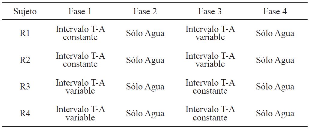 A lo largo de todas las sesiones del experimento se implementó un programa de entrega de agua cada 30 segundos. Cada sesión consistió en la ocurrencia de 60 ciclos de entrega de agua. A través de cuatro fases experimentales, con un número de 25 sesiones cada una, se manipuló la presentación de un estímulo sonoro de 5 segundos de duración. En la primera fase se presentó el estímulo justo antes de cada entrega de agua para dos ratas (R1 y R2), mientras que para las otras dos (R3 y R4) el estímulo ocurría aleatoriamente en cualquiera de seis ubicaciones temporales que segmentaban el intervalo entre entregas de agua, es decir, durante los primeros cinco segundos del ciclo entrega de agua, durante los segundos 6 a 10, y así sucesivamente. En la segunda fase se presentaron únicamente las entregas de agua para las cuatro ratas. En la tercera fase se revirtieron las condiciones de presentación del tono respecto a la Fase 1, estableciendo un intervalo tono-agua variable para las ratas R1 y R2, así como la presentación contigua tono-agua para las ratas R3 y R4. En la cuarta fase se presentó nuevamente sólo la entrega de agua cada 30 segundos. En la Tabla 1 se resume el diseño experimental empleado en este trabajo. La duración del estímulo sonoro y el intervalo entre emparejamientos se estableció de acuerdo con valores semejantes empleados en la literatura para estos parámetros (e.g., Meyer, Cogan, & Robinson, 2014), aunque en condiciones espaciales diferentes. Si bien, es común que en los procedimientos de condicionamiento clásico se realice la presentación de emparejamientos entre el estímulo condicional y el estímulo incondicional, seguida de una fase en la que se presenta únicamente el estímulo condicional, en el presente estudio se optó por hacer la presentación del agua (que podría considerarse como el estímulo incondicional) en las fases 2 y 4, debido a un interés en la comparación directa entre las dimensiones molares del desplazamiento cuando se presentaba un estímulo relevante para las ratas mientras se encontraba o no emparejado con un estímulo neutral, más que en el supuesto control que pudo haber desarrollado el tono.