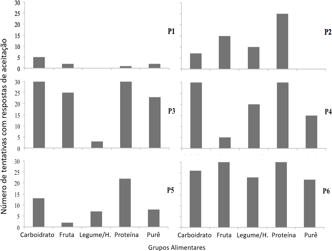 Referente à P5, é possível notar que a aceitação geral dos alimentos alcançou nível moderado (44 tentativas). Os índices por grupo foram os seguintes: baixo em frutas (duas tentativas) e legumes/hortaliças (sete tentativas), além da aceitação de purê (oito tentativas); moderada em carboidrato (13 tentativas); alto em proteína (22 tentativas). Durante o experimento, P5 aceitou apenas maçã do grupo de fruta, e alface de legume/hortaliça, porém não aceitou em todas as tentativas dos mesmos. Apesar de um nível baixo de aceitação em frutas e legumes/hortaliças, houve aceitação diferente do relatado no questionário (Tabela 1). Com relação aos carboidratos, no questionário foi indicado que ele só comeria arroz e batata, porém, no procedimento apenas aceitou macarrão.