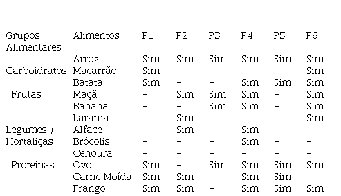 Em relação aos resultados gerais obtidos, foi possível observar que P1 alcançou nível baixo em todos os grupos alimentares; P2 demonstrou preferência por proteína; P3 indicou nível alto na maior parte dos grupos, com exceção de legumes/hortaliças; P4 alcançou índice alto em dois grupos (carboidrato e proteína), um moderado (legumes/hortaliças) e um baixo (fruta); P5 obteve um nível alto, índice moderado em um grupo também e baixo em dois; P6 alcançou alto índice em todos os grupos.