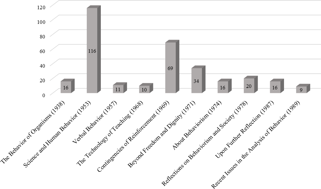 Para identificar os registros textuais de Skinner, foi utilizado o artigo: “Acesso a Skinner pela sua própria obra: Publicações de 1930 a 1990” (Carrara, 1992), que é uma lista completa de todos os textos de Skinner, inclusive reedições, reimpressões e onde foram republicados. Foram selecionados todos os livros acadêmicos que tivessem Skinner como único autor, obtendo-se uma lista de 10 livros: (1) The Behavior of Organisms: An Experimental Analysis (1938); (2) Science and Human Behavior (1953); (3) Verbal Behavior(1957); (4) The Technology of Teaching (1968); (5) Contingencies of Reinforcement: A Theoretical Analysis (1969); (6) Beyond Freedom and Dignity (1971); (7) About Behaviorism (1974); (8) Reflections on Behaviorism and Society (1978); (9) Upon Further Reflection (1987); e (10) Recent Issues in the Analysis of Behavior (1989). O livro Walden II, apesar de conter discussões que remetem ao tema da sexualidade, não foi selecionado por ser um romance e não uma obra acadêmica.